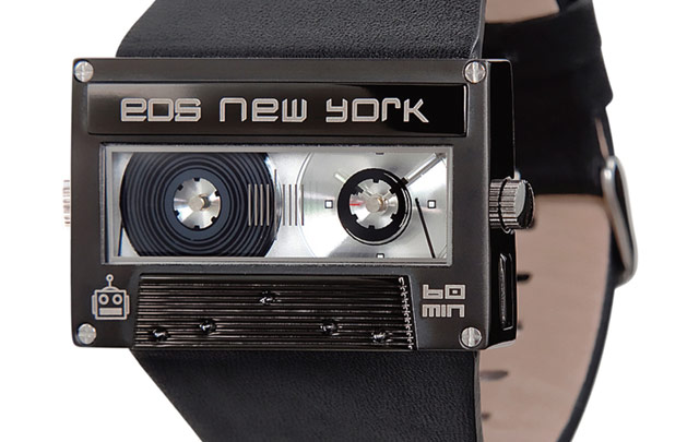 Kun kello käy, näyttää siltä kuin kasettinauhuri liikuttaisi c-kasettia. Kellotaulu on ovelasti piilotettu oikeanpuoleiseen kelaan. 131,50 e.