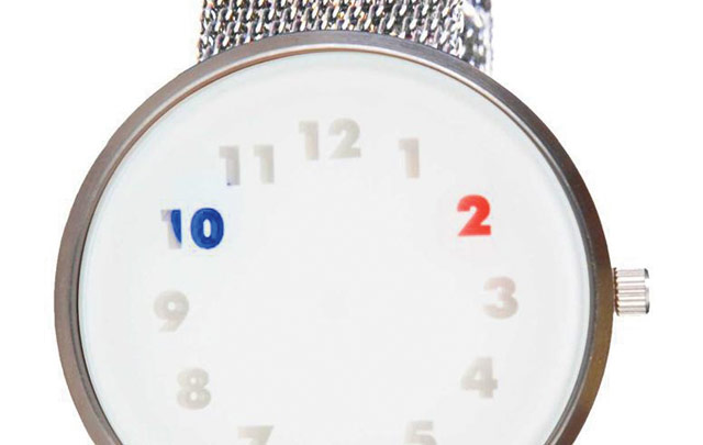 Viisarit on niin passé. Sininen väri merkkaa tunteja ja punainen minuutteja. Ja kelatkaapa tätä: kun kello on tasan 12, väri muuttuu violetiksi! 103,10 e.