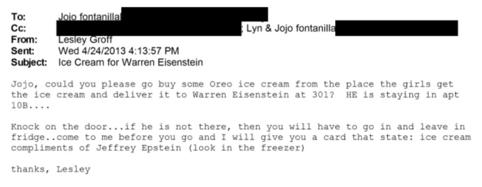 Koputa oveen… jos hän ei ole paikalla, sinun täytyy mennä sisään ja jättää jäätelö jääkaappiin… tule minun luokseni ennen kuin menet, niin annan sinulle kortin, jossa lukee: “jäätelö Jeffrey Epsteinin tarjoamana” (katso pakastimesta). – Kiitos, Lesley”
