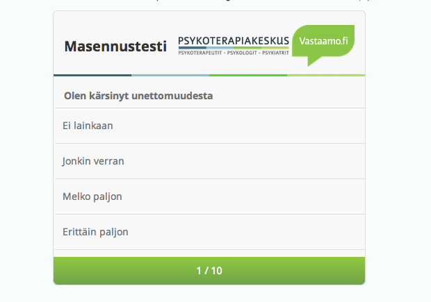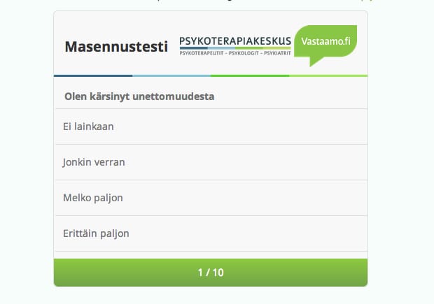 Psykoterapiakeskus Vastaamo tarjoaa kotisivuillaan maksuttoman masennustestin, jonka voit tehdä verkossa itse. Testin tuloksia tulkittaessa tulee huomioida, että tulos on vain suuntaa antava. Masennusdiagnoosin todennäköisyys kasvaa pistemäärän kasvaessa. Vähintään 12 pistettä saavista noin puolella diagnosoidaan masennnus. Voit tehdä testin muutaman päivän välein ja seurata masennuksesi kulkua. On tavallista, että masentuneen olo vaihtelee jopa päivittäin. Luotettavan diagnoosin tekemiseen tarvitaan psykiatrin tutkimus.