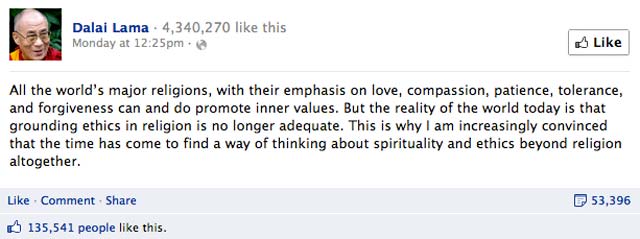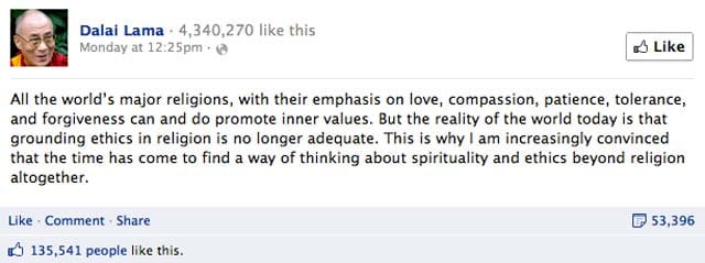 ”Maailman kaikki pääuskonnot, jotka korostavat rakkautta, myötätuntoa, kärsivällisyyttä, suvaitsevaisuutta ja anteeksiantoa, voivat kannattaa ja kannattavat sisäisiä arvoja. Mutta tosiasia nykypäivänä on se, että etiikan perustaminen uskontoon ei ole enää riittävää. Tämän vuoksi olen yhä vakuuttuneempi siitä, että on aika pohtia hengellisyyttä ja etiikkaa uskonnon ulkopuolella”, Dalai-lama kirjoitti Facebookissa.