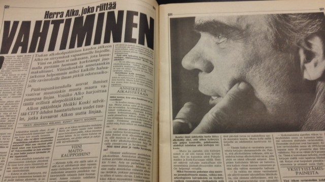 Kun City-lehti kirjoitti syyskuussa 1986 suomalaisesta alkoholipolitiikasta, olivat jutun väliotsikot kuin suoraan tästä päivästä. Alkon pääjohtaja Heikki Kosken haastattelussa kyseltiin, milloin viinit tulevat ruokakauppoihin, kerrottiin kontrollista ja kielloista, joilla meitä holhotaan ja toivottiin, että kaupat on auki pidempään.