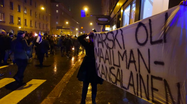Illan kunnioitettavimman kohtaamisen mielenilmauskulkueen kanssa järjestivät kuitenkin Riikka Palokorpi ja Salla Huikuri, jotka tervehtivät kulkuetta lakanalla, jossa luki “Marski oli maailmankansalainen”.