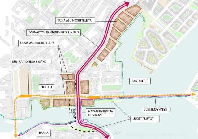 Uudet suunnitelmat tarkoittavat sitä, että iso osa autoliikenteestä joutuu väistymään. Autoilu on tarkoitus kieltää Hakaniemenrantakadulla Sörnäisten rantatien ja Haapaniemenkadun välillä. Autojen tilalle saadaan pikaraitiotie.