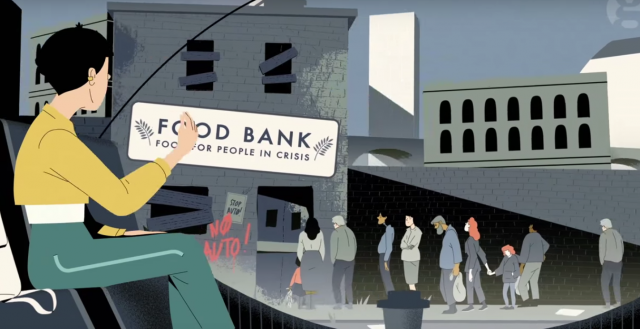 Tulevaisuusanimaatiossa Alice lähtee töihin ja työmatkalla selviää, millaiseksi maailma on muuttunut: otsikko kertoo, kuinka huhut työpaikoista ovat aiheuttaneet pakolaiskriisin Intiassa, työmatkalla vastaan tulee yli 30-vuotiaiden vanhainkoti ja ruokapankin edessä kiemurtelee pitkä jono nälkäisiä.