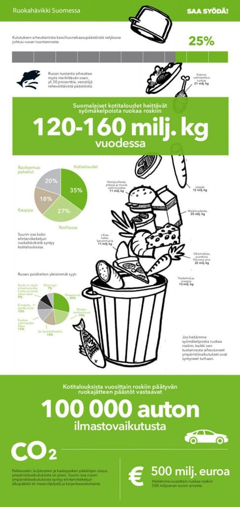 Jos idea toimii Vantaalla, sitä kannattaisi monistaa muuallekin, sillä ruokahävikki on tuntuva ongelma. Suomessa lentää syömäkelpoista ruokaa roskiin vuodessa 120-160 miljoonaa kiloa eli 20-30 kiloa henkeä kohden. Ruokahävikin määrä vaihtelee huomattavasti eri kotitalouksien välillä ja kodeista heitetään ruokaa hukkaan puolet enemmän kuin kaupoista. Kaupan myymättä jääneitä tuotteita on mahdollista kanavoida niihin talouksiin, joissa ruoasta on pulaa.
